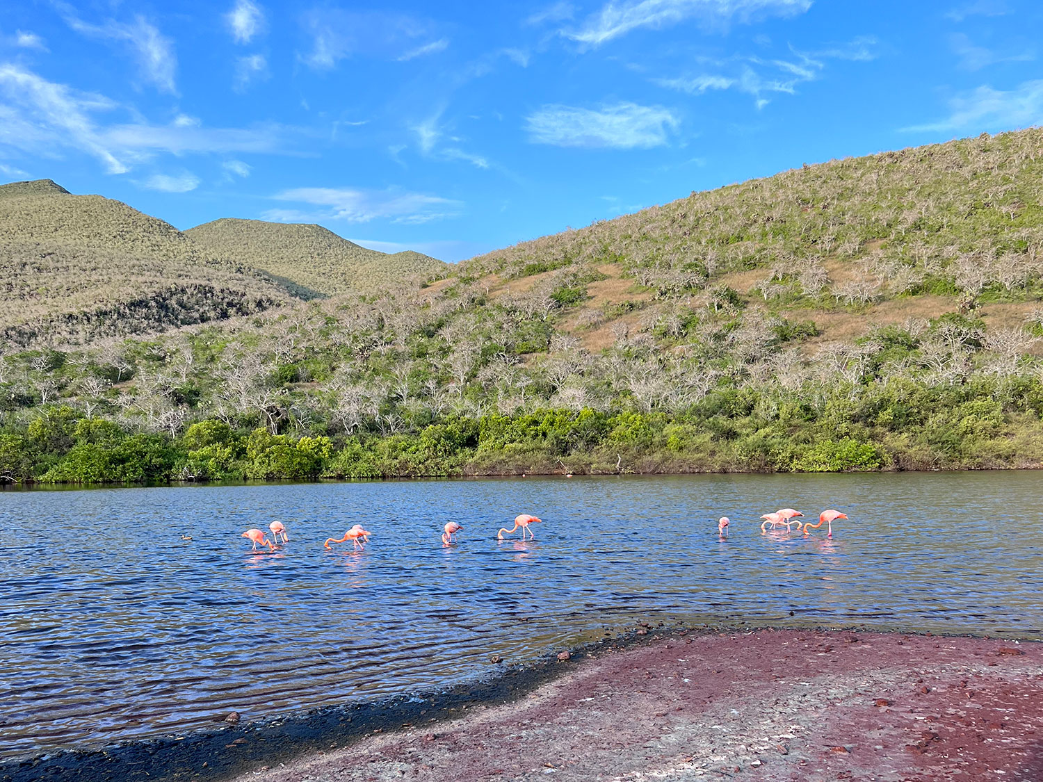 Rábida and Sombrero Chino: On Rábida, the day begins very early, as the group lands on a red beach first thing in the morning. As the lagoon came into view, speckles of hot pink appeared all throughout the water. There were so many bright, beautiful flamingos in the lagoon, in addition to incredible plant life.