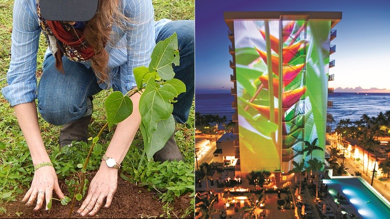 'Alohilani Resort has partnered with the Hawaiian Legacy Reforestation Initiative to plant 100,000 indigenous trees on Oahu, donating a portion of every guest's stay towards that cause. Plus, it doesn't utilize single-use plastics, takeout containers from its restaurants are compostable, and the landscaping consists of drought-tolerant and native plants. 'Alohilani Resort has also participated in the Mālama Hawaii program in the past, where guests get incentives for giving back and volunteering during their trip to Hawaii. At one point, guests who booked the Unforgettable, Soulful Hawaii package received a $200 credit to use at the resort's multiple restaurants and the chance to plant a tree at Gunstock Ranch on the North Shore, among other benefits.