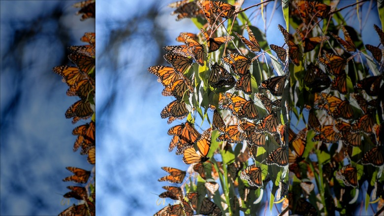 There's an observation deck and a short boardwalk that runs through the butterfly preserve at Natural Bridges State Beach, which is accessible by strollers and wheelchairs. You might even want to lie down on the boardwalk (if it's not busy) to take in the sight of thousands of butterflies — numbers vary from year to year, but it can be around 10,000. The butterflies will congregate together in large bunches in the trees while the weather is cool, but once it gets to about 55 or 60 degrees Fahrenheit, the clusters will start to break apart, and you can see them flying amongst the trees.