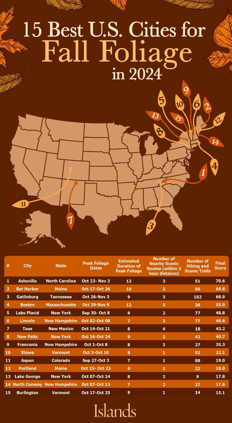 Here at Islands, we analyzed the most popular destinations to experience the glorious changing colors, and picked the top 15 best fall foliage spots where we're expecting to see an incredible display of autumn color this year. From New England gems like and Stowe, Vermont, Bar Harbor, Maine, and Boston to intriguing destinations such as Taos, New Mexico and Gatlinburg, Tennessee, this list has something for every fall foliage lover. While nature can be unpredictable, we're expecting a seasonal explosion of color this year — and you can see it all from some of our favorite hiking trails and scenic routes.