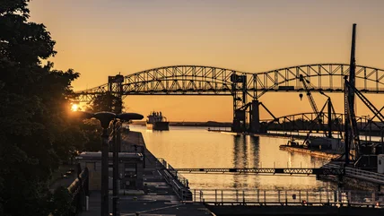 The St. Mary's River divides the U.S. from Canada and Lake Superior from Lake Huron. Along its shores, the city of Sault Ste. Marie has been a place where Native Americans gathered, fished, and hunted for centuries. By the time French settler Father Jacques Marquette founded the city in 1668, Native Americans had established a thriving community along the river, spread out along both sides of the water. Today, the city — which belongs to Ontario on its north shore and Michigan on its south shore — is famed for the Soo Locks, a system that moves boats from the deep water of Lake Superior to the shallower water of Lake Huron by raising and lowering water levels in the river within several connected chambers.