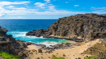 Halona Beach Cove is a testament to nature's design; the small sandy beach is framed by dramatic volcanic rocks, creating an almost theatrical setting where the ocean performs its eternal dance. Crystal-clear waters reveal a vibrant underwater world, where schools of tropical fish swim between the coral and green sea turtles explore its depths. During the winter months, the surrounding waters welcome humpback whales, and the cove offers the chance to see these magnificent creatures breaching.