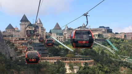 Ba Na Hills sits on a mountaintop roughly 30 minutes from Da Nang and an hour from Hoi An (also known as the mini Venice of Vietnam). The park was originally established in 1919 by French colonists hoping to create a retreat for European travelers. A century later, it has evolved into a whimsical entertainment complex. Its architecture features preserved ruins alongside modern replicas of old French buildings, and the village is bursting with eateries, attractions, and a theme park. But the best part? Getting there is half the adventure. This destination sits nearly 5,000 feet above sea level, and the only way to travel here is via cable car — the longest nonstop single-track cable car in the world. The 20-minute journey passes high above lush jungle and cascading waterfalls with sweeping views of Da Nang's coastline.
