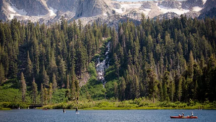Beginner skiers or double-diamond shredders aren't the only lucky ones who can enjoy the majestic views of Mammoth Mountains' lakes and evergreens in California's Eastern Sierra Nevadas. That same backdrop of trees and glacier-fed lakes makes summer camping in Mammoth such a treat. If you're lucky enough to secure a summer camping reservation in Mammoth's Inyo Forest, the Twin Lakes Campground — not to be confused with Twin Lakes further north in Bridgeport – is a favorite for fishing, kayaking, and its breathtaking beauty. Located at an elevation of 8,600 feet where lodgepole pines provide shady spots, here you'll find a large waterfall cascading into one of the area's two lakes.