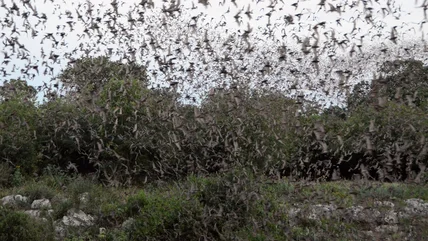 A few hours before sunset, visitors to Bracken Cave will see millions of bats come pouring out of the sinkhole and take to the sky to eat their body weight's worth of insects. The sound of flapping wings is so loud that it sounds more like rushing water than a cloud of flying mammals. There are several viewing platforms throughout the park where guests can watch the bats take flight, a process that can take over four hours because there are so many.