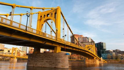 Pittsburgh is known as the City of Bridges, and the Roberto Clemente Bridge is one of its most famous. It's one of the "Three Sisters" bridges, a trio of yellow self-anchored suspension bridges that cross the Allegheny River. Along with the Roberto Clemente Bridge, which is also called the Sixth Street Bridge, there's also the Andy Warhol Bridge (also called the Seventh Street Bridge) and the Rachel Carson Bridge (also called the Ninth Street Bridge). All three were constructed between 1924 and 1928 and later renamed after famous Pittsburgh residents. Roberto Clemente was a legendary baseball player on the Pittsburgh Pirates, and he was chosen as the bridge's namesake due to its proximity to the Pittsburgh Pirates baseball field at PNC Park. If you walk across the bridge to PNC Park, you'll pass a Roberto Clemente statue, too. On game days, the bridge is closed to traffic and becomes pedestrian-only.