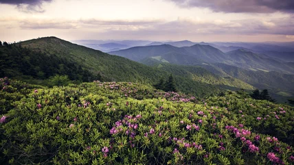 The Appalachian Trail runs east to west across Carvers Gap, and each direction offers a different experience. Eastbound, the trail takes you to the largest area of grassy balds in the Appalachians, while westbound takes you up the Roan High Knob through a dense forest that opens up to sweeping views of the mountains. Whether hiking or driving, you can take in the views of the five summits of Roan Mountain, which are lined with hardwood forests of spruce fir and wildflower-covered balds. Those visiting in the summer can marvel at the rhododendron bloom, which typically begins in mid-June. If you're looking to enjoy views of the balds but without making a super long trek to do so, you can stop at Carvers Gap and do a .7-mile walk to the summit across a meadow that leads you to beautiful vistas of the area.