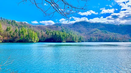 Located 100 miles west of Asheville (a drive that takes roughly two hours via US-74) is Santeetlah Lake and its corresponding small town on one of the lake's peninsulas. The town of Lake Santeetlah is home to roughly 50 permanent residents, despite having nearly 200 homes available. Although the population is small, there are still several marinas and boat rental locations available for guests who want to get out on the water. Because 80% of the Lake Santeetlah shoreline is part of the Nantahala National Forest and managed by the U.S. Forest Service, the majority of this lake is open all year and considered public land. This lake exists because the locals dammed the Cheoah River in 1928. While it's not the largest man-made North Carolina lake, it still offers 76 miles of untouched shoreline and 2,800 acres of water.