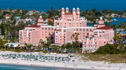 Located just south of St. Pete Beach with its award-winning white sand and vibrant downtown, if you cross over from the mainland via the Pinellas Bayway, you can't miss it: The colossal Mediterranean Revival-meets-Art Deco palazzo sits between Gulf Boulevard and the sea, painted in pastel bubblegum pink with lace-white trim, perched on the white sands of St. Pete Beach for nearly a century. Today, the Don CeSar — known as "the Pink Palace" or "the Pink Lady" — is a resort offering full waterfront access and white-sand beach, gorgeous restaurants, heated pools, ornate fountains, and even, some say, the lonely ghost of its visionary, Thomas Rowe.