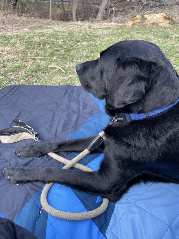 The Columbia Outdoor Blanket from Costco, available at an almost irrationally affordable $12.97, is a 72-by-72-inch dark blue blanket with a printed Columbia logo on one side and rolls up for easy packing and carrying. It even has an adjustable carry strap to facilitate portability. Slim, quilted, and machine washable, this blanket is durable enough to resist your pup's toe knives and withstand years of heavy use. It's also fairly water-resistant, meaning your dog won't wake up to a damp blanket when morning dew settles on the second day.