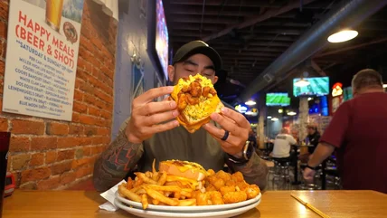Participants have 2 hours to finish a 3-pound grilled cheese sandwich made with 6 slices of Texas toast and 18 slices of American cheese, plus a full order of mac and cheese and a full order of fried white cheddar cheese curds. That amount of food by itself would prove daunting to the everyday eater, but there's even more to the dish – the plate also includes a combined pound of fries and tater tots. If there's one thing Wisconsin does well, it's cheese, so the dish's overall theme makes sense. It's definitely not for the lactose-intolerant.