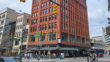 Shinola Hotel may be a modern boutique hotel, but the history of its storied facade dates back decades. Located at 1400 Woodward Avenue, the hotel property comprises five buildings in Downtown Detroit that hearken back to bygone eras. Among the property's past lives, one building once housed the Singer sewing machine company in the 1930s, and the hotel's main building was a historic hardware store built in 1915.