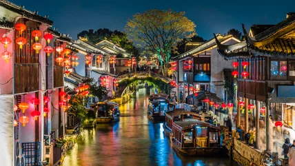 It's along the canals where the Venice comparison feels most fitting. In historic districts like Pingjiang Road, narrow lanes run parallel to the water, lined with charming teahouses, small museums, shops, and traditional houses. As night falls, red lanterns flicker to life, casting warm reflections across the canals, while arched bridges frame postcard-perfect views, lending the center a charming aesthetic not too dissimilar to Taiwan's romantic Jiufen, home to the teahouse that was the inspiration for the anime Spirited Away.