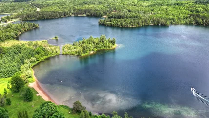 Bewabic State Park is a peaceful and quiet place, centered around Fortune Lake, part of the larger Fortune Lakes chain. There are several interesting historic structures built by the Civilian Conservation Corps (CCC) — besides stone restrooms, stoves, and drinking fountains, there's an impressive log bathhouse. The park also has a tennis court and a playground for staying active, and a picnic area with a shelter for relaxing. You may spot wildlife like deer, porcupines, or red foxes, and birds such as pileated woodpeckers and eastern bluebirds. Anglers can cast a line for walleye, bluegill, perch, and bass, and there's a beach for swimming. All these activities, combined with trails, paddling, and camping, make Bewabic a great pick for a lake vacation.