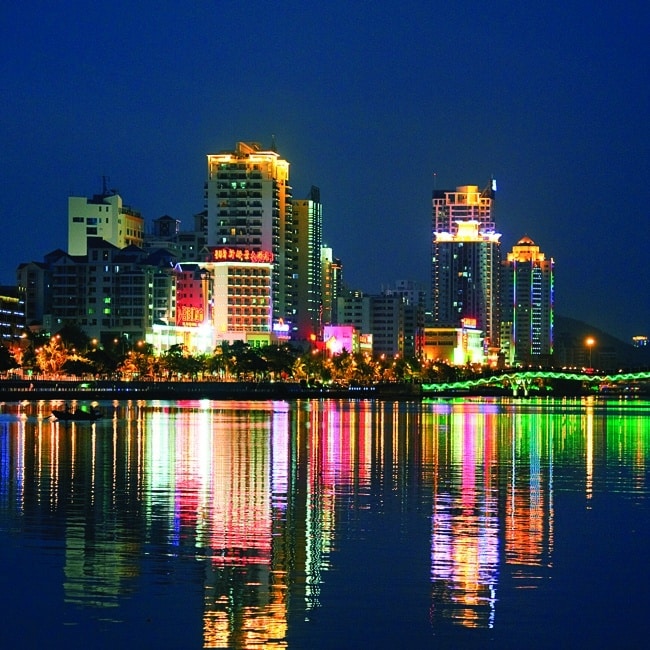One moment a farmer leads a water buffalo to a field, then I blink and five gleaming-white high-rise hotels appear. Brendan and I are on the decidedly modern Hainan Eastern Expressway, headed north to Riyuewan (translated "Sun and Moon Bay") to do something I wondered if I'd ever do in China: surf with locals. The freeway's path up the eastern coastline exposes old and new Hainan. Tiny agrarian villages with rice paddies and rows of taro give way to hotels under construction. Most have billboards with oddly translated English tag lines like "Grasp your ultimate dreams of water and sun at Crystal Ocean Pointe." I can't help but laugh.